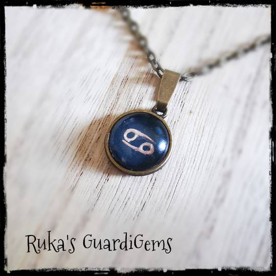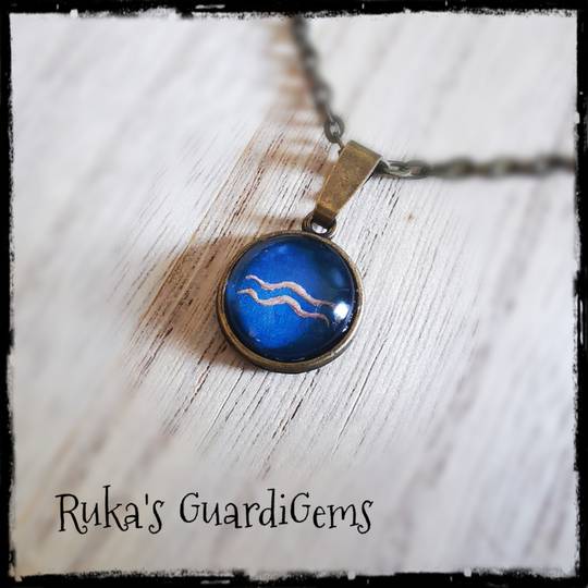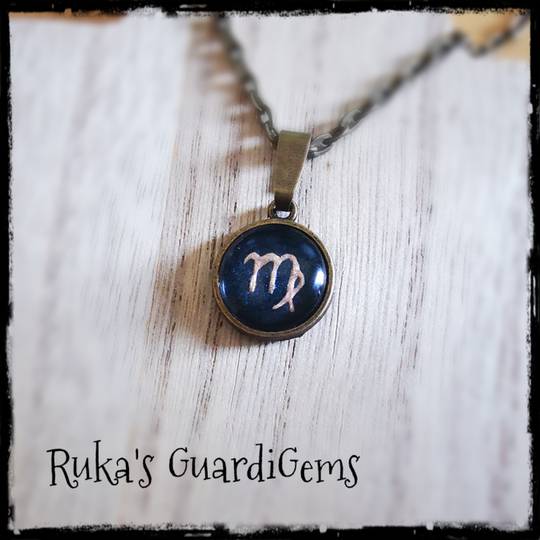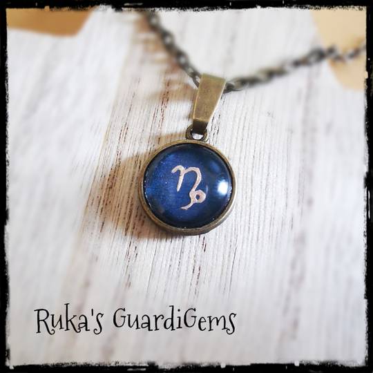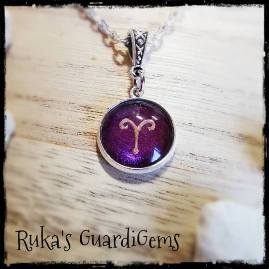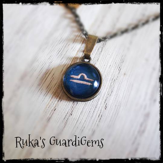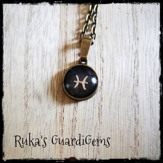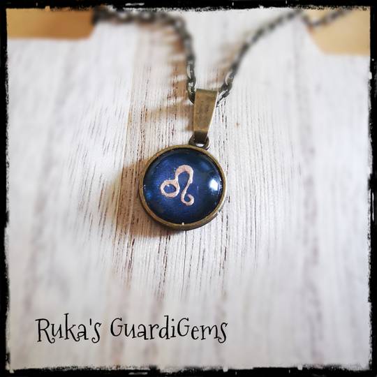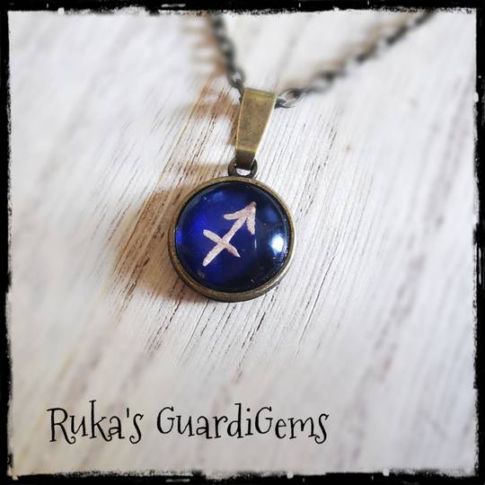 Das Sternzeichen liegt sicher hinter einem Glascabochon und wird in einen 14 mm großen Anhänger aus Edelstahl eingefasst. Kombiniert wird es mit einem silberfarbenen 50 cm langen Gliederkettchen aus einer Messinglegierung.